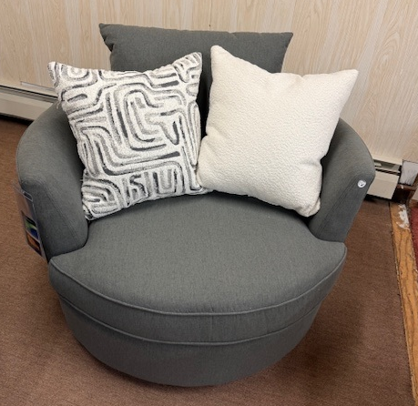 Round out your living room with the contemporary curves of this chair lounger. This inviting swivel chair beckons you to kick off your shoes and snuggle up. A tight barrel back completes the circle with a loose back pillow and several oversized throw pillows.