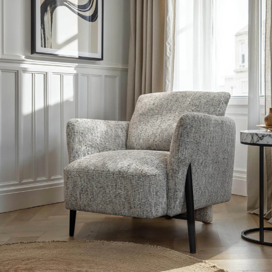 A touch of effortless comfort. Wrapped in a soft tweed fabric, this chair features sleek front metal legs that seamlessly integrate with the frame, creating a clean and cohesive look.