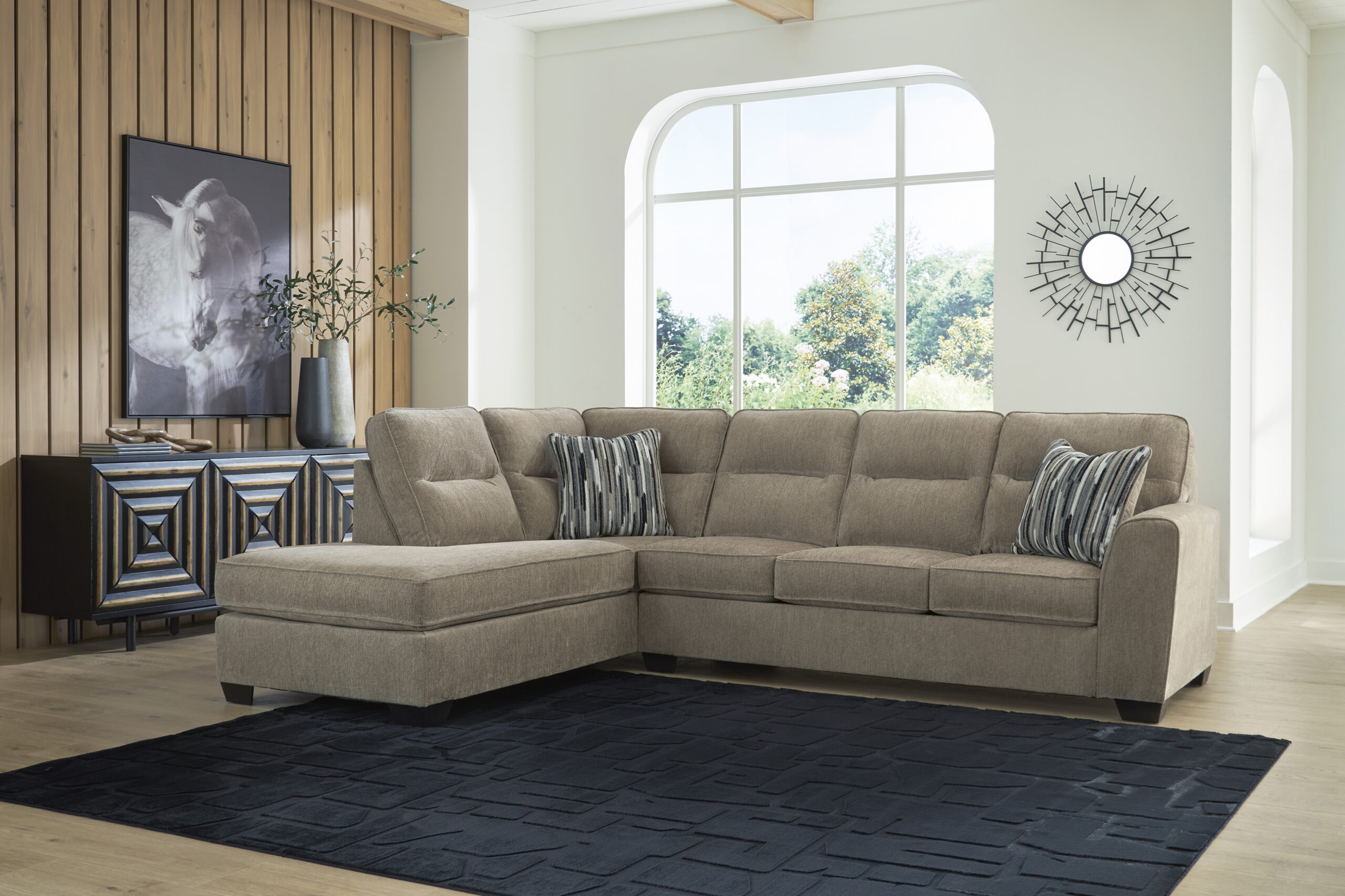 Strike a balance between the indulgent comfort you crave and the contemporary aesthetic you long for. The fabulously soft, mocha-colored upholstery of this sectional with chaise takes neutrals to new heights. Plus there’s plenty of room to spread out and relax solo or with your besties. Geometric-patterned accent pillows perfect the richly on-trend aesthetic.