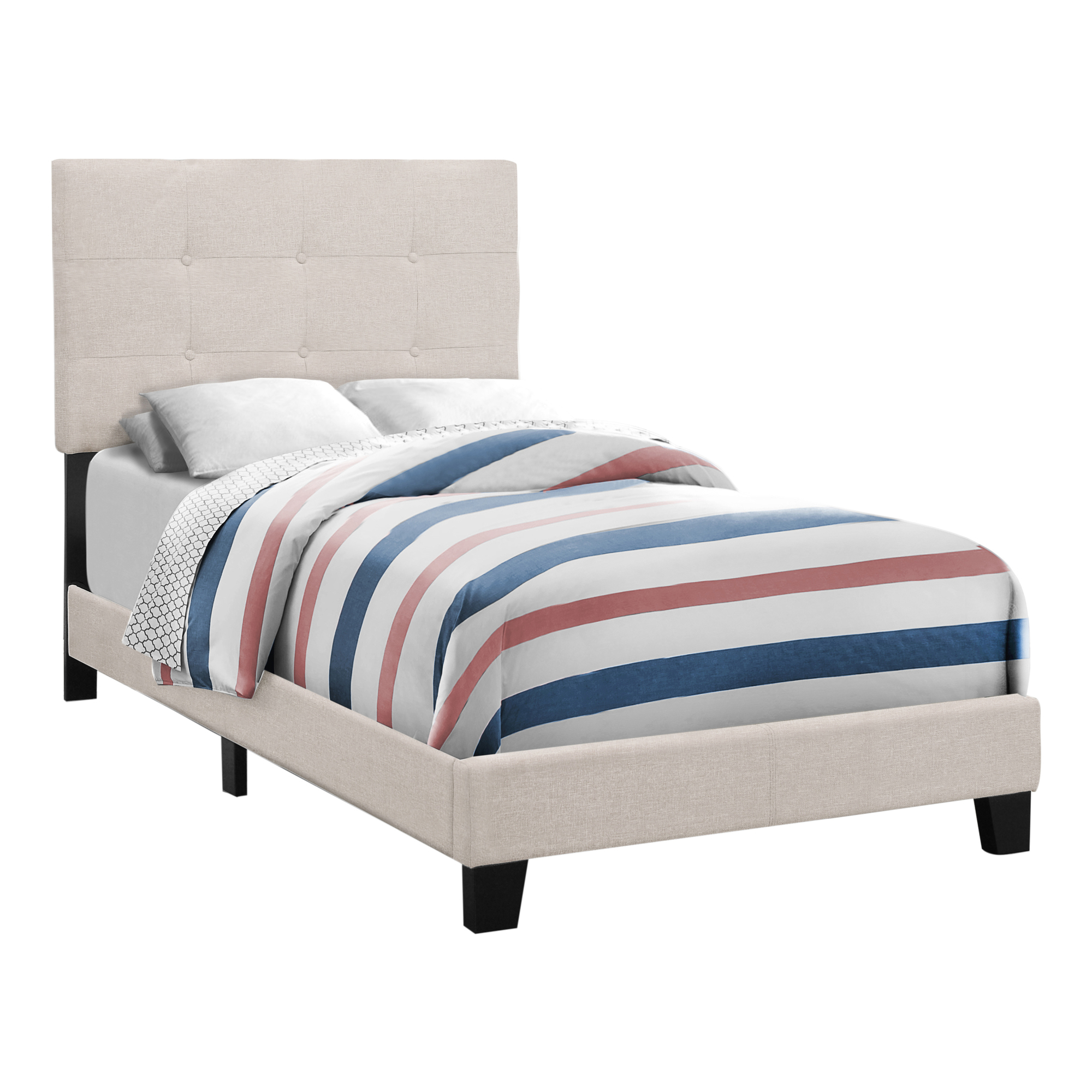 - Low profile twin bed frame upholstered in a beautiful beige linen look fabric; padded headboard boasts an elegant tufted design