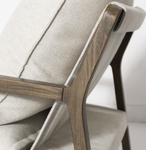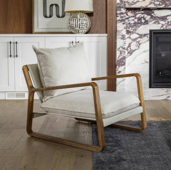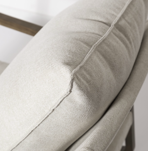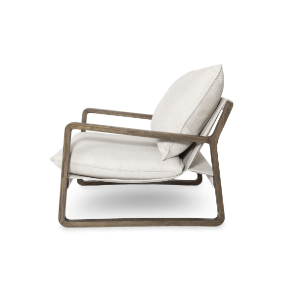 This low sling chair with an exposed bourbon coloured wood frame and thick plush cream cushions quietly shouts relax. Hip and stylish, this throwback design is comfortable and trendy all in one.