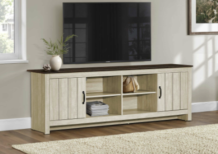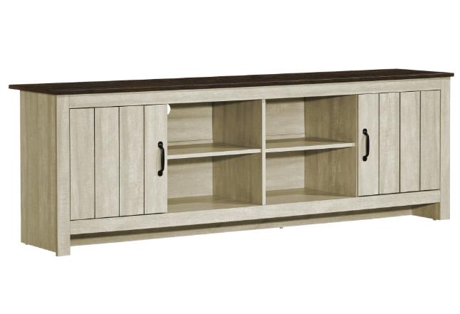 Elevate your entertainment experience with our stunning 72 inch tv stand that perfectly blends functionality and style. This versatile tv console boasts a striking two-tone design featuring a chic light beige laminate base complemented by a rich brown oak laminate top. Designed with plenty of open and closed storage, this media entertainment center effortlessly enhances any contemporary living room with its rustic appeal. The 4 open cubbies with fixed shelving are perfect for showcasing your favorite decor or easily accessing gaming consoles. The 2 storage cabinets on either side with elegant black metal handles keeps your media essentials organized and neatly hidden away, along with 2 pre-drilled wire management holes behind the open shelves. This TV stand is durably designed to support all your entertainment needs with solid construction that promises longevity. Easy-to-assemble instructions and hardware included, setting up your new favorite piece has never been simpler. When it comes to upkeep, you’ll love the easy-to-clean top, ensuring your stylish centerpiece remains flawless with minimal effort. Update your living area and enjoy movie nights like never before with this must-have tv stand that perfectly combines practical storage solutions and trendy aesthetics!