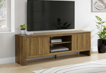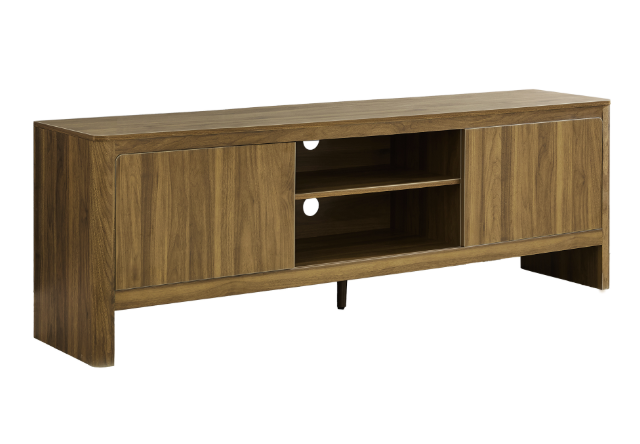 Elevate your living room or bedroom with this stunning 72 inch dark walnut tv stand, a perfect blend of contemporary flair and modern functionality. This fashionable media entertainment center is not just a stylish addition to your decor, but this console is built for performance, durability, and organization. Featuring solid construction and a stunning dark walnut laminate finish, this modern tv stand is designed to showcase your audio/visual components beautifully while providing ample closed storage for your entertainment essentials. With two doors that are equipped with a convenient push latch mechanism, your devices will stay protected and organized yet easily accessible. The fixed open shelves give flexibility to display your devices, with 2 cable management holes behind these shelves to keep cords neatly concealed. The smooth, easy-to-clean top makes wiping away spills and dust a breeze, keeping your entertainment area looking pristine.